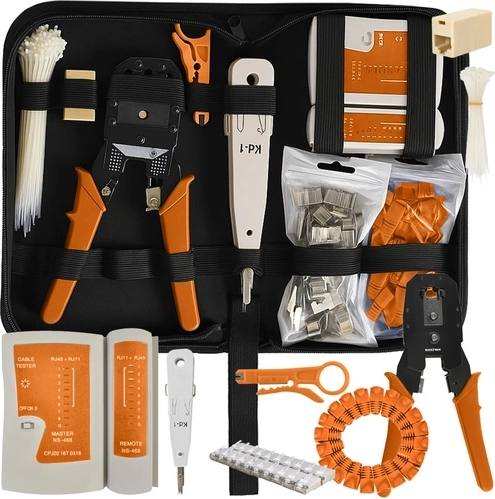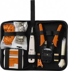 Sættet indeholder alle nødvendige værktøjer: krympeværktøj, afisolering, indsættelse af konnektorer, RJ45 konnektorer og hylstre, inklusive en æstetisk taske, der giver mulighed for at starte arbejdet med det samme.