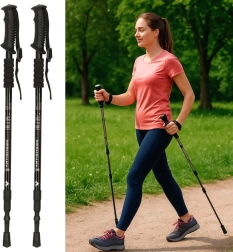 Let og holdbar sammenklappelige trekkingstænger lavet af aluminium, ideel til Nordic Walking. Nem justerbar længde med lås og ergonomiske håndtag for komfortabelt greb.