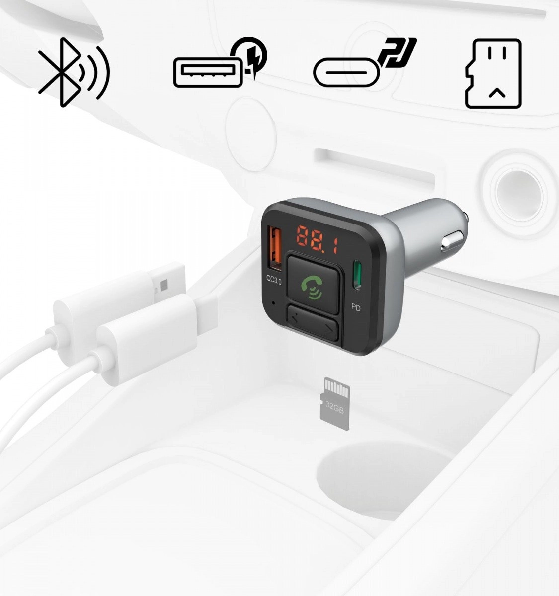 FM-transmitteren med Bluetooth gør det muligt at overføre lyd fra dine enheder, såsom smartphones eller tablets, direkte til enhver bilradio. Takket være Bluetooth-teknologien kan du lytte til din yndlingsmusik uden brug af kabler.