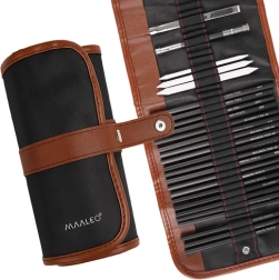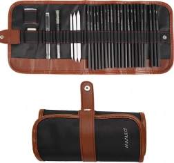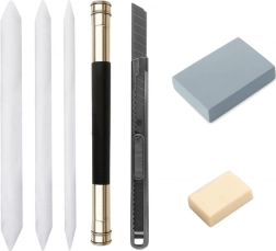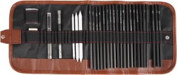 I specifikationen finder du: 18 tegnblyanter med forskellig hårdhed, 3 kulblyanter, blyantforlænger, 3 blandestumper, viskelæder, papirkniv og et stilfuldt sort etui.