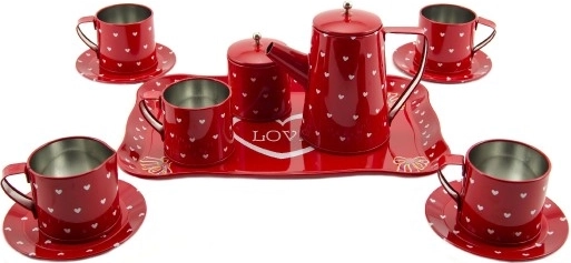 Det røde servise er dekoreret med hvide hjerter, hvilket giver det et romantisk og samtidig legende udseende. Hvert stykke er omhyggeligt afstemt for at skabe en harmonisk helhed, der fremmer børns fantasi.