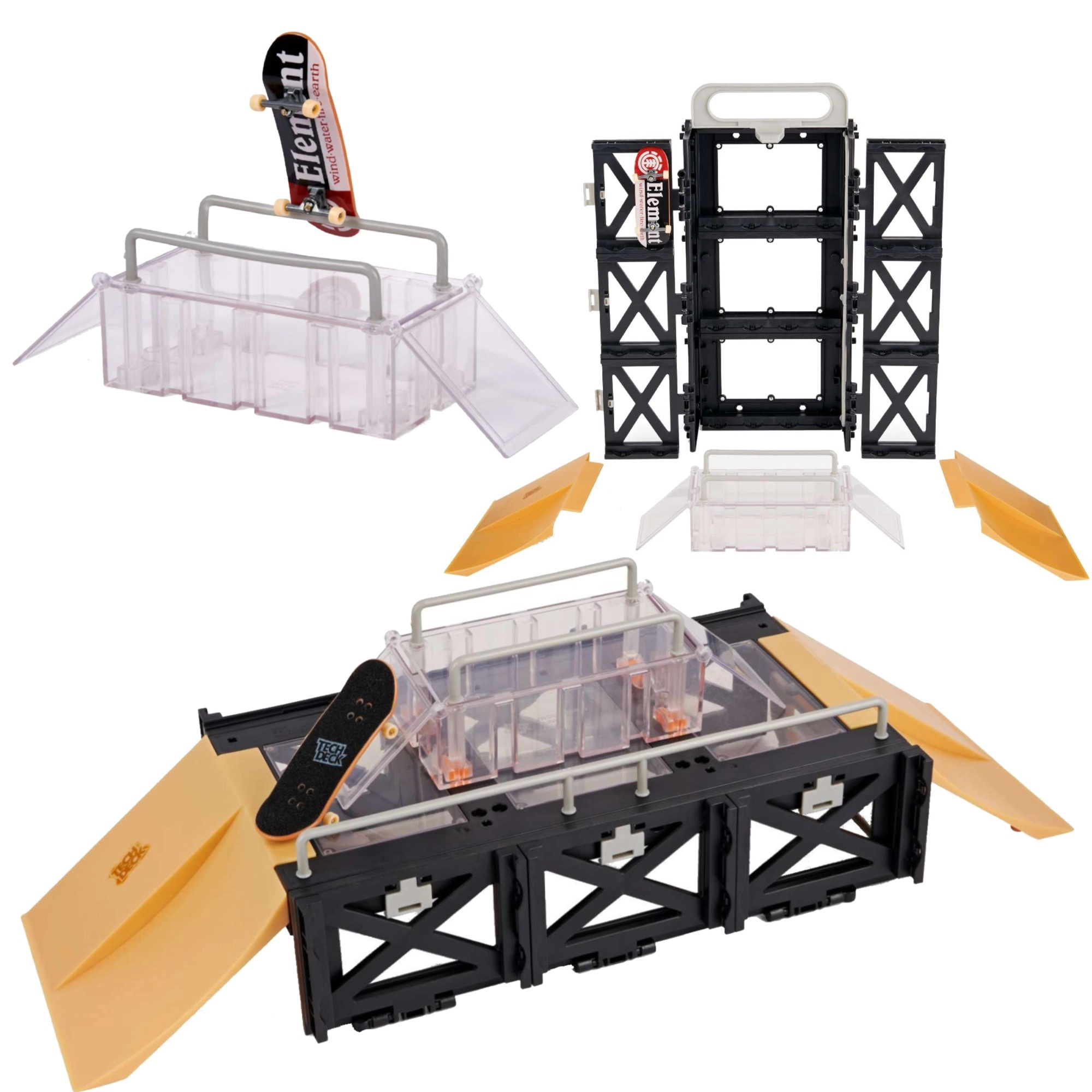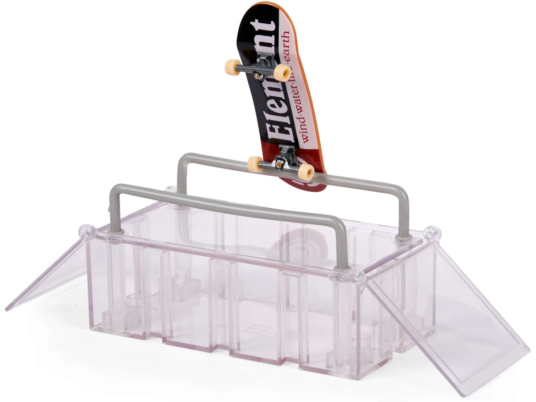 - 1× Tech Deck ELEMENT fingerboard, 1× etui/stander, boks med hængsler, 2× udklappelig kicker, 4× lodret kobling, 1× højre kicker med dobbelt nedkørsel, 1× venstre kicker med dobbelt nedkørsel, 2× høje rails, 1× langt rail, vejledning