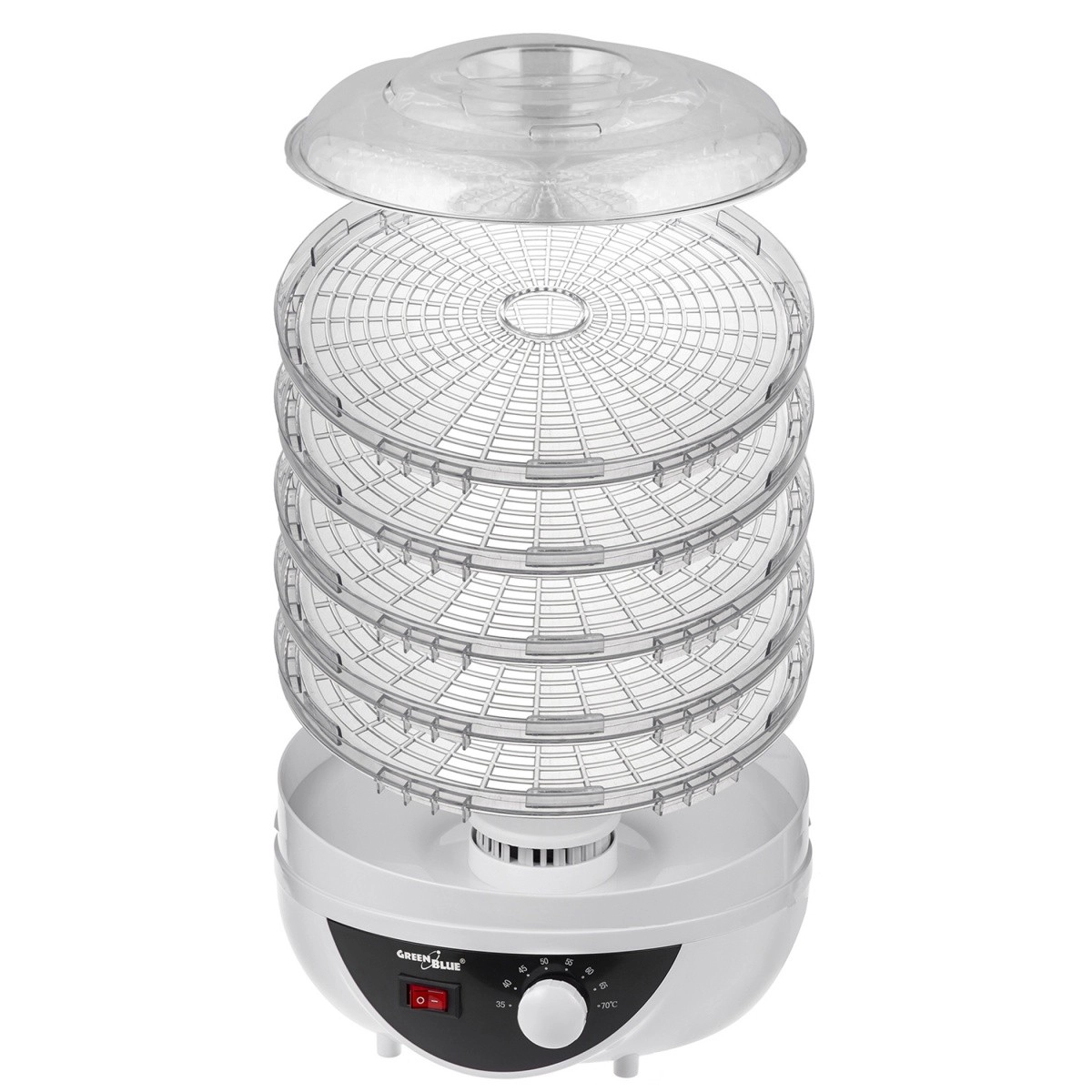 Tørremaskinen har fem gennemsigtige og let stabelbare bakker, som gør det muligt effektivt at tørre forskellige typer fødevarer samtidig.