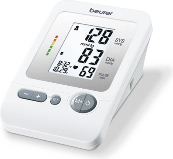 Den automatiske blodtryksmåler BM 26 leverer præcise målinger af blodtryk og pulsfrekvens på overarmen. Takket være farveskala for risiko og arytmi-genkendelse er den ideel til hjemmebrug for op til fire brugere.