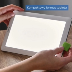 Praktisk, kompakt design i tabletstørrelse (15,6 x 23,6 cm) gør denne lampe til en ideel ledsager i hverdagen – derhjemme, på kontoret eller på rejser. Når den tilsluttes, giver den et ekstra skud dagslys, når du har brug for det.