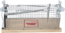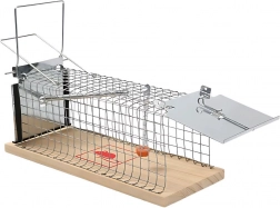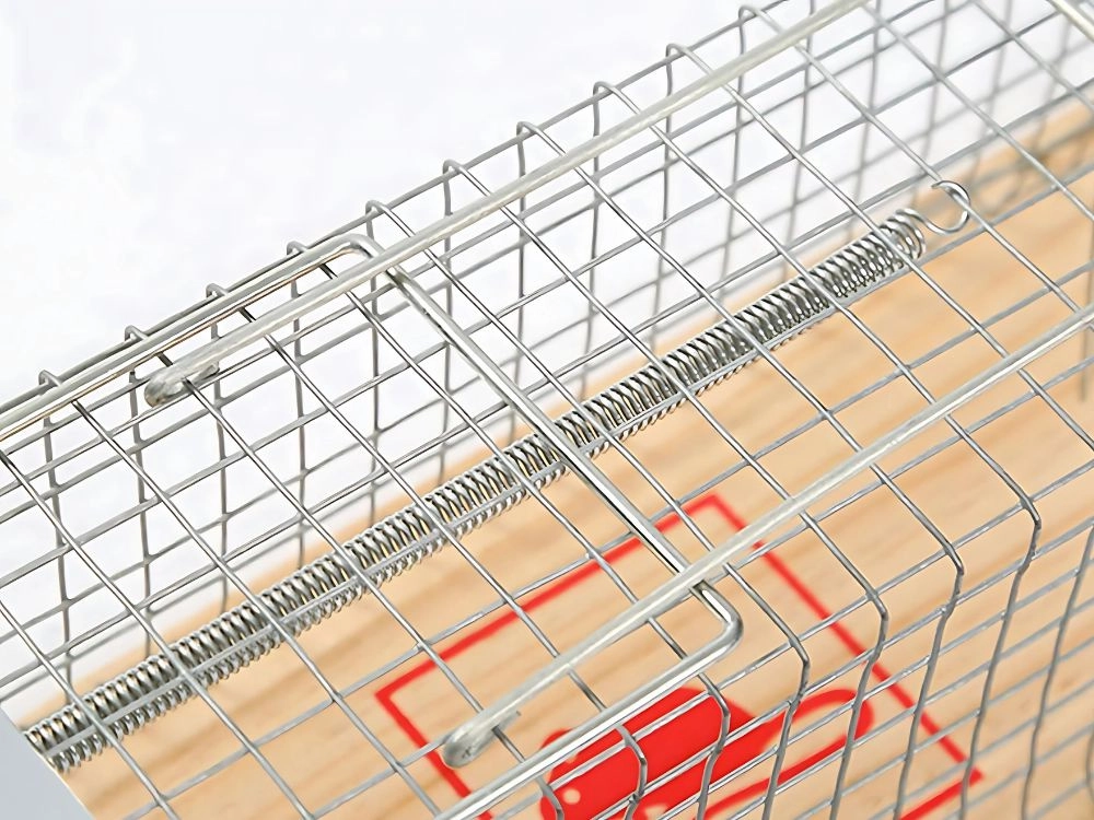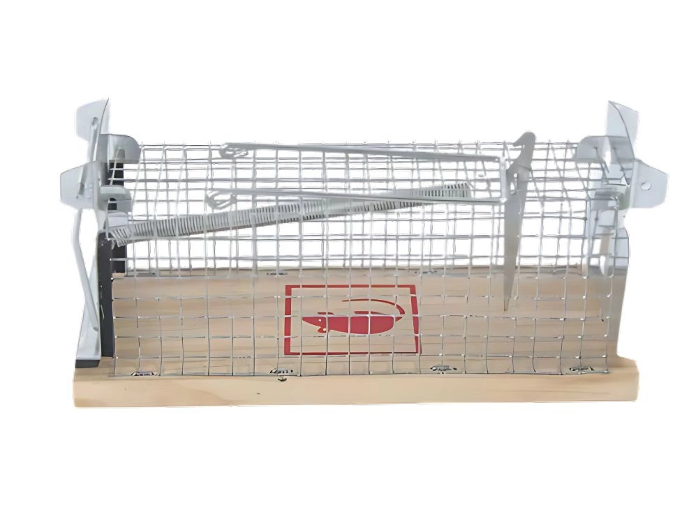 Dette metalfælde er designet til sikker og effektiv fangst af små skadedyr uden brug af gift. Den er lavet af ståltråd og en træbase, hvilket giver holdbarhed og sikker håndtering.