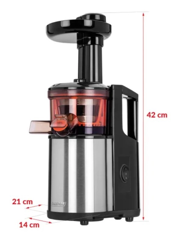 Enheden arbejder ved lave hastigheder (60 omdr./min.), hvilket presser juicen præcist og jævnt. Den indvendige snegl sikrer langsom og nøjagtig presning uden overdreven opvarmning og skumdannelse af juicen. Den gør det muligt at få drik ud af de fleste typer grøntsager, frugter og urter, inklusive dem der ikke kan behandles i en standardjuicer, såsom persille, spinat, salat, hvedegræs, hindbær, ribs, ananas, mango og flere.