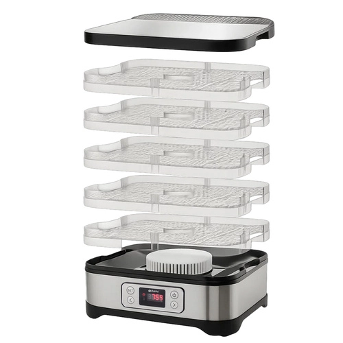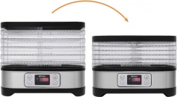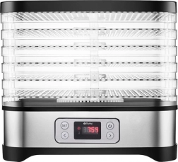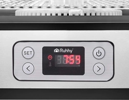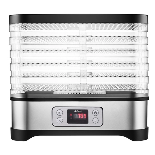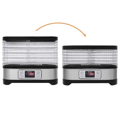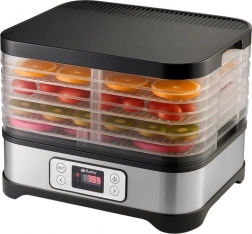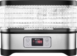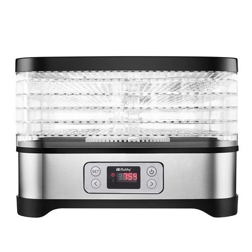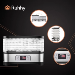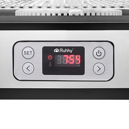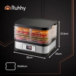 Universelt Ruhhy tørreapparat med en effekt på 400 W gør det nemt at tørre svampe, frugt, grøntsager og urter. Det er udstyret med 5 bakker med en samlet kapacitet på 10 liter, justerbar temperatur (35–70°C) og en letlæselig skærm med timer op til 24 timer. Et ideelt valg til hjemmeopbevaring hele året.