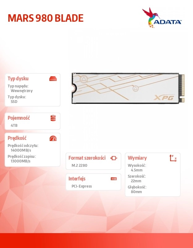 SSD-drev XPG Mars Blade er det første PCIe 5.0 SSD-drev designet til bærbare computere. Med lynhurtige læse-/skrivehastigheder på op til 14.000/13.000 MB/s og kapacitet op til 4TB leverer det stabil ydeevne til selv de mest krævende opgaver.