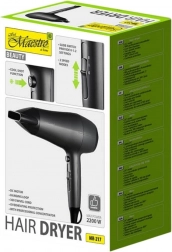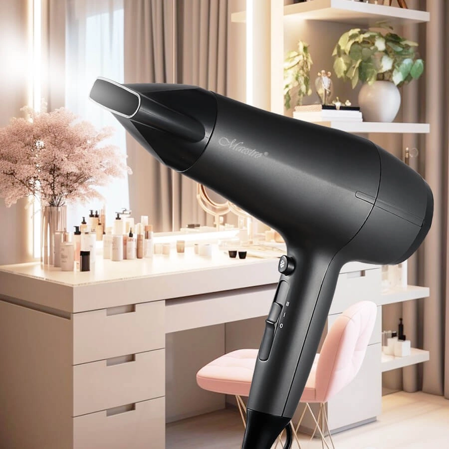 Hårtørrer Maestro er udstyret med en DC-motor, som garanterer lang levetid og støjsvag drift. I pakken finder du en koncentrator, som muliggør præcis styring af luftstrømmen, ideel til at skabe forskellige frisurer.