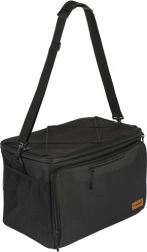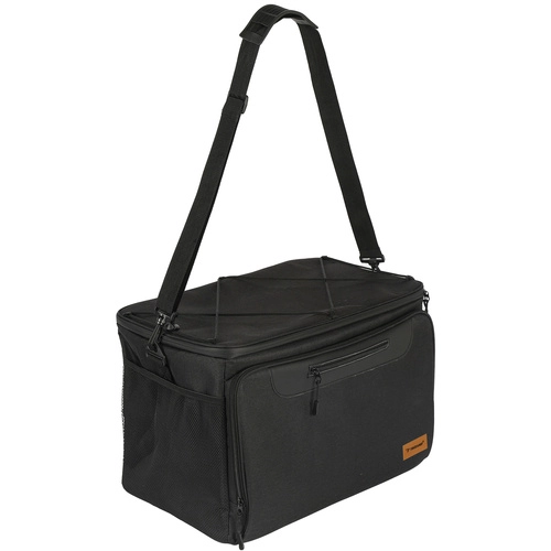 Til bæring er den udstyret med en behagelig, justerbar skulderrem med beskyttende pude, hvilket sikrer komfort selv ved højere belastning. Tasken er også vandtæt, hvilket betyder, at du trygt kan stille den på vådt græs eller sand.
