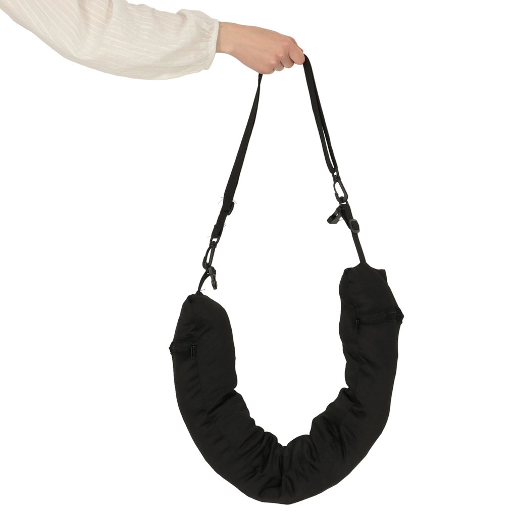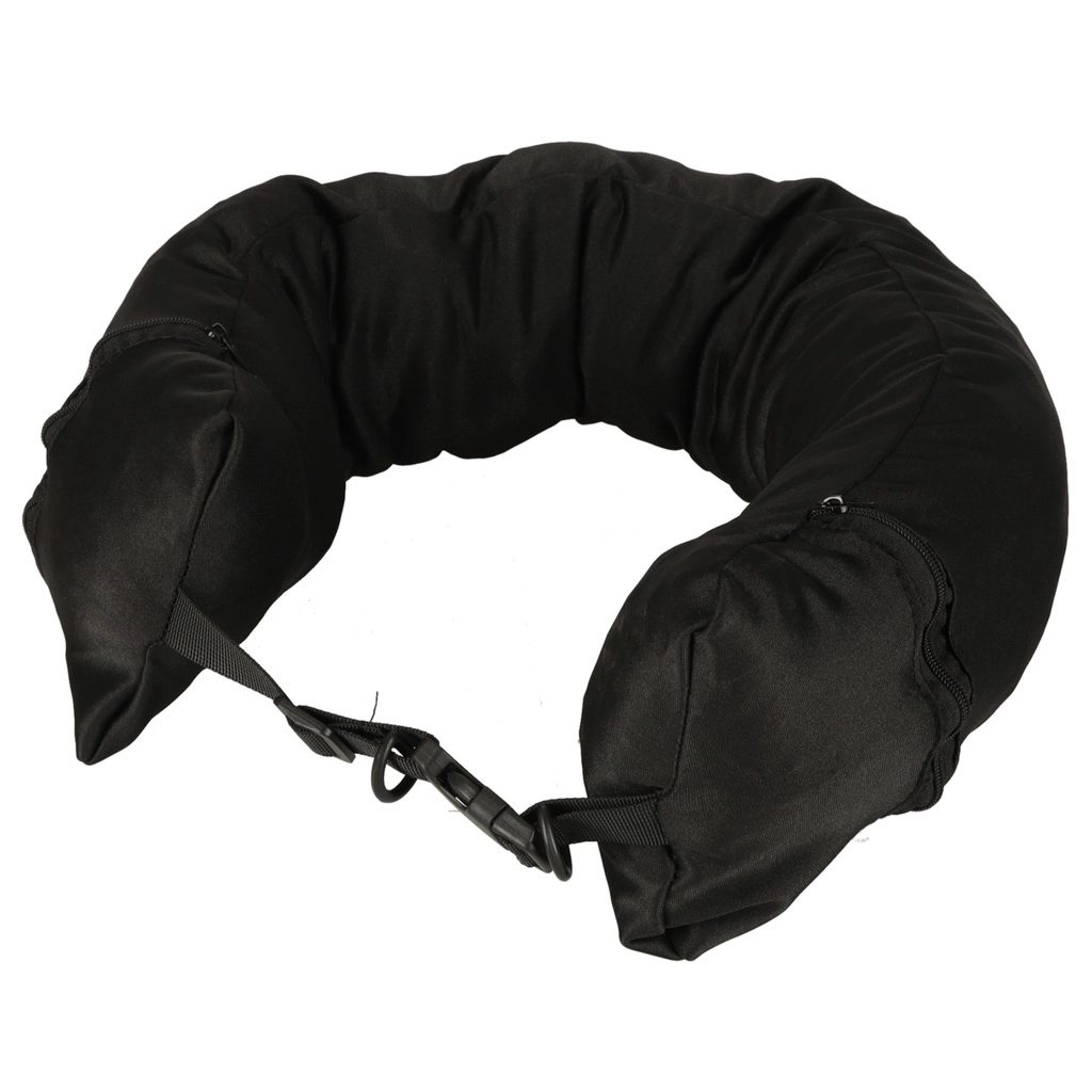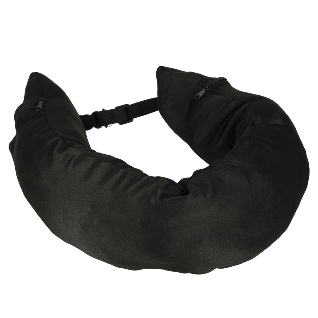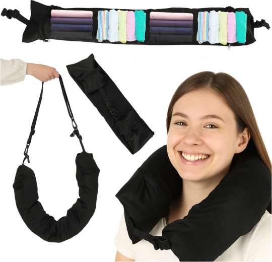 Denne rejsepude er den ideelle rejsefælle. Den er udstyret med forreste lukning i form af en spænde, hvilket sikrer stabilitet og komfort under brug. Den indvendige store lomme giver en praktisk opbevaringsløsning til dine personlige ejendele. To sidelommer med lynlås giver nem adgang fra begge sider, hvor de venstre og højre lommer forbindes indeni.