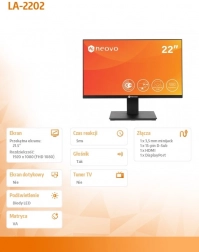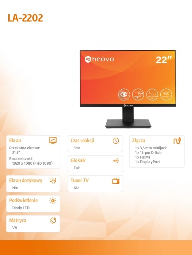 Skærm 22 tommer ideel til kontor- og hjemmebrug med HDMI-, DisplayPort- og D-SUB-tilslutning.