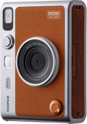 Brun kunstlæder, sølvfarvede accenter og taktile knapper giver Instax mini Evo et unikt look og et behageligt greb til heldagsfotografering.