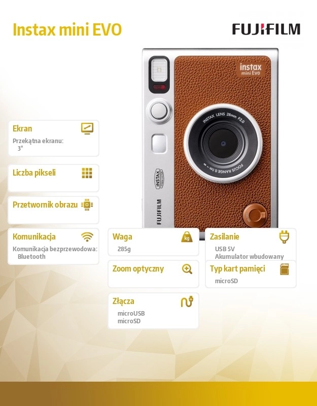 Instax mini Evo bringer en unik kombination af digital kontrol og analog oplevelse. Retrodesignet med brun kunstlæder og sølvdetaljer ligger godt i hånden, mens de praktiske kontroller lader dig hurtigt indstille kompositionen og straks printe på INSTAX mini-film. Takket være den lysstærke f/2.0-linse får du smukke fotos selv i skumring.