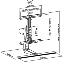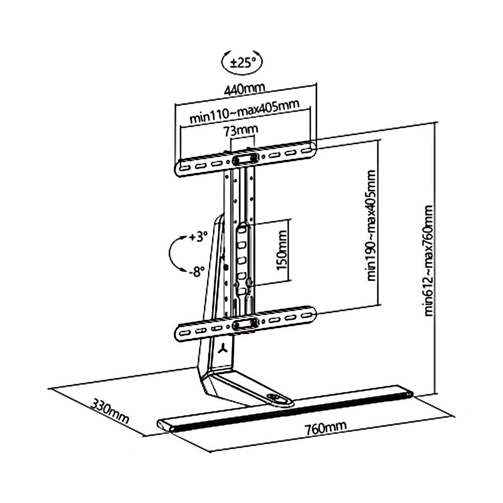 Kompatibilitet: Stativet er velegnet til skærme fra mærker som Sony, LG, Samsung, Philips, Sharp, Panasonic, Toshiba og andre. Det tilbyder nem montering for skærme med VESA-standard: 200x200, 300x200, 300x300, 400x200, 400x300, 400x400.