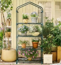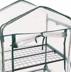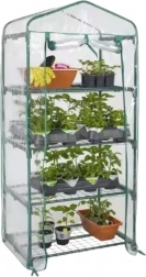 Drivhuset er udstyret med fire hylder: to i fuld bredde og to halve, hvilket gør det nemt at organisere pladsen alt efter planternes højde. En praktisk dør med lynlås giver hurtig og bekvem adgang til indersiden.
