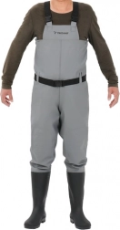 TRIZAND fiskewaders er designet til alle fiskeentusiaster, der sætter pris på kvalitet og komfort. Takket være den vandtætte konstruktion og det slidstærke PVC‑materiale er de helt uigennemtrængelige og modstår krævende forhold. Det justerbare bælte og selerne gør det nemt at tilpasse pasformen til din krop, mens den skridsikre ydersål med mønster giver fremragende greb på glatte og stenede overflader.