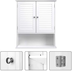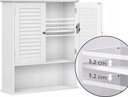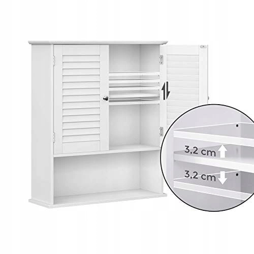 Skabet har en justerbar indvendig hylde, som du kan tilpasse efter dine behov til opbevaring af forskellige ting, såsom kosmetik, rengøringsmidler eller høje flasker. Låger med robuste metalhængsler sikrer lang levetid og stabilitet, mens sølvfarvede greb giver skabet en elegance, der passer til mange forskellige interiører.