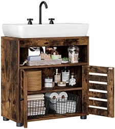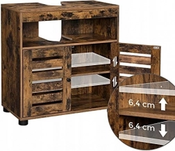 Skab et æstetisk og funktionelt badeværelsesmiljø med dette rustikale underskab til håndvask. Dets kompakte, men rummelige design hjælper med at organisere håndklæder, kosmetik og hygiejneprodukter, samtidig med at det bevarer et elegant udtryk. Fremstillet af holdbar spånplade i en trendy rustik brun finish, tilfører det varme og karakter til ethvert rum.