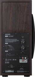 Den robuste konstruktion i 18 mm MDF minimerer resonanser, mens den brune træfinish sikrer et æstetisk udtryk. RCA-indgange og -udgange giver bred kompatibilitet med andre enheder.