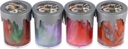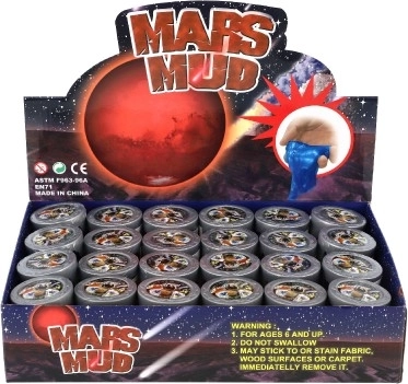 Det metalliske slim Mars Mud glæder både børn og voksne. Det har en behagelig, langsomt flydende konsistens, som er nem at forme, strække og klemme. Det gennemsigtige bæger fremhæver de originale farvehvirvler og den metalliske glans.