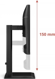 Det ergonomiske design muliggør højdejustering op til 150 mm, tilt i området -5° til +23°, rotation på ±175° samt pivot-funktion til at dreje skærmen 90°. Antirefleksbehandling og reduktion af blåt lys sikrer komfort ved længere tids brug.