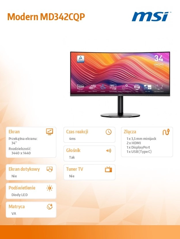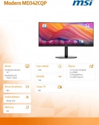 Modern MD342CQP løfter produktivitet og underholdning til et nyt niveau. Med UWQHD-opløsning på en 34" skærm har du mere plads til apps, tidslinjer og sidepaneler. Skærmens krumning trækker dig ind i indholdet og forbedrer det perifere syn, uanset om du redigerer fotos, klipper video eller fordyber dig i spil.