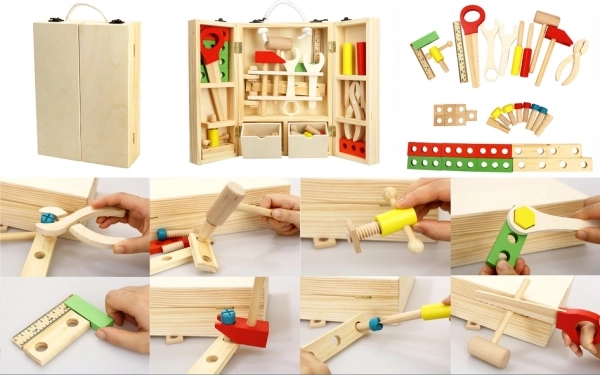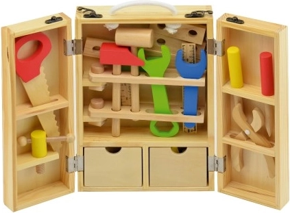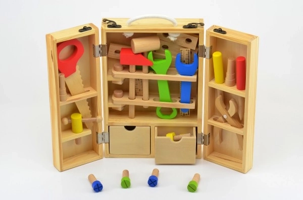 Træværktøj til børn i en praktisk kuffert! En fantastisk sæt til små håndværkere, der udvikler motorik og kreativitet.