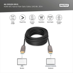 Hybrid HDMI AOC-kabel muliggør overførsel af ukomprimeret billede og lyd over lange afstande med høj båndbredde. Eliminerer elektromagnetisk interferens takket være en hybridstruktur af kobber- og optiske fibre.