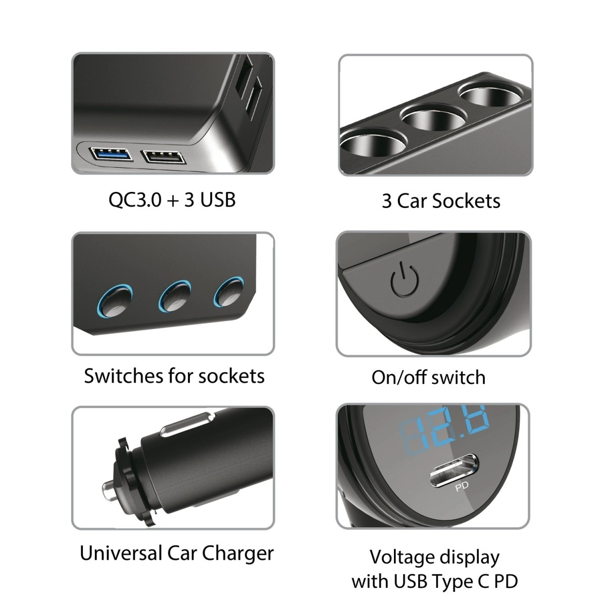 Denne splitter-adapter er ideel for alle, der har brug for at oplade flere enheder på én gang under bilkørsel. Den understøtter ultra-hurtig opladning via Qualcomm Quick Charge 3.0 og Power Delivery 18W USB‑C, hvilket er ideelt til moderne smartphones som iPhone 8/8 Plus/X.