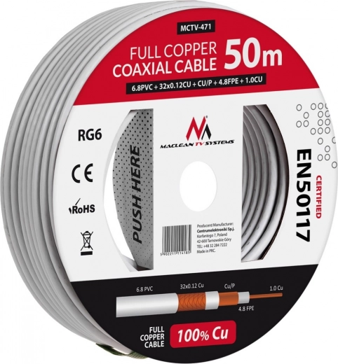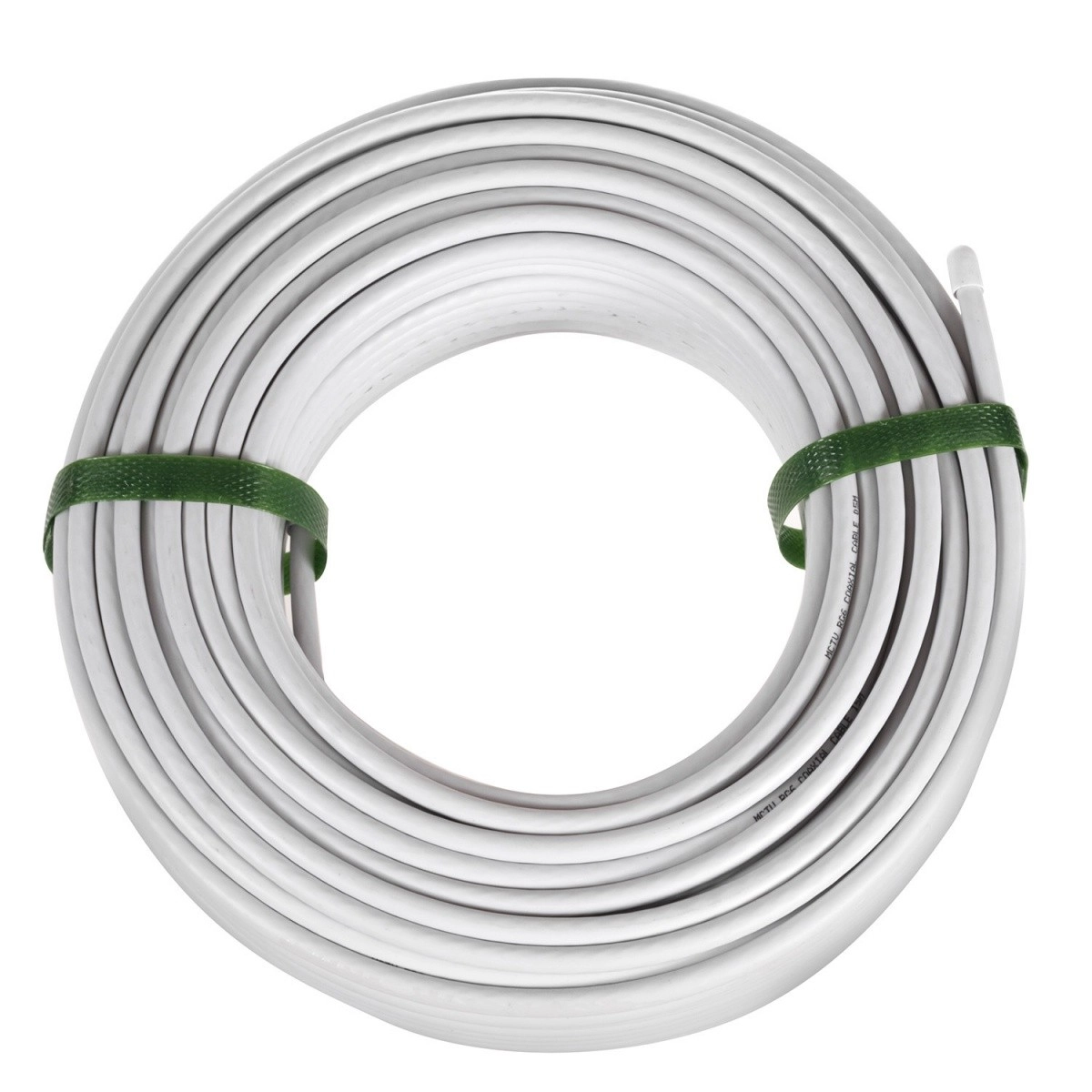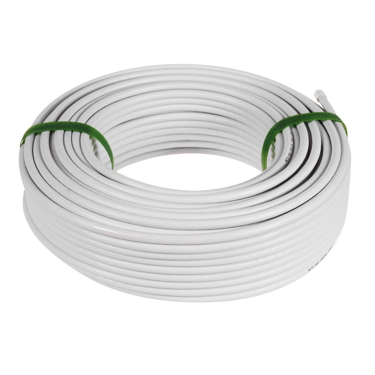 Højkvalitets koaksialkabel RG6 i massiv kobber, 50 meter, sikrer fremragende signaloverførsel uden forstyrrelser, selv ved lange installationer.
