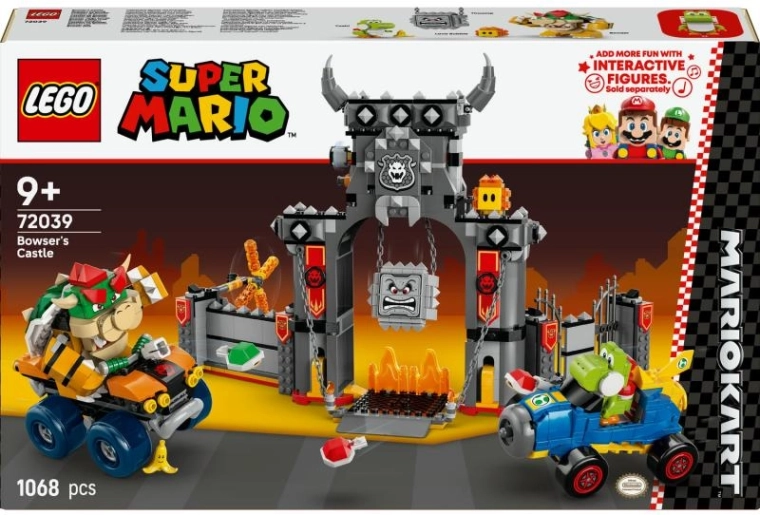 Træd ind i en verden af ræs og dueller i det legendariske Bowsers slot. Dette store sæt med 1068 klodser bringer masser af legeelementer: sammenklappelige slotsmure, roterende Fire Bar, en faldende Thwomp i kæde og interaktive lavaforhindringer. Der medfølger fire samlerfigurer – Bowser, Yoshi, Thwomp og Lava Bubble – samt skaldprojektiler og en banan til spændende dueller på banen.