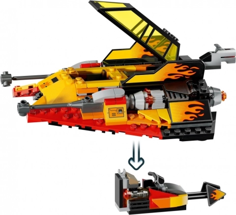 Den åbnbare dobbeltcockpit skjuler en aftagelig speeder – tryk på sædet eller minifigurens hoved for straks at sende speederen i aktion.