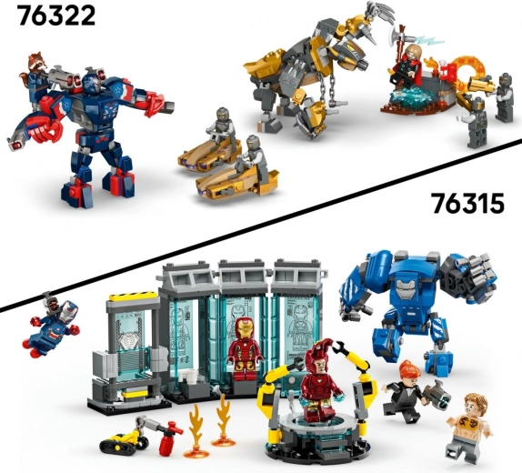 Oplev et episk opgør mellem godt og ondt med ikoniske helte fra MARVEL-universet. Sættet leverer realistisk action: en grøn Hammer-drone med fjederbetjent skyder, en blå drone med dobbelte skydere, minifiguren IRON MAN med blå blastere og minifiguren WAR MACHINE med røde blastere og en skuldermonteret klodsekaster.