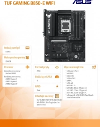 Bundkortet ASUS TUF GAMING B850‑E WIFI kombinerer kraften fra de nyeste AMD Ryzen‑processorer til socket AM5 med gamingfunktioner og militær holdbarhed. Takket være effektstærk strømforsyning, omfattende køling, støtte til DDR5 og hurtig Wi‑Fi‑forbindelse leverer det stabil ydeevne til lange gamingmaratoner og krævende AI‑applikationer.