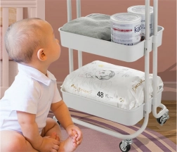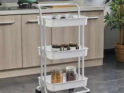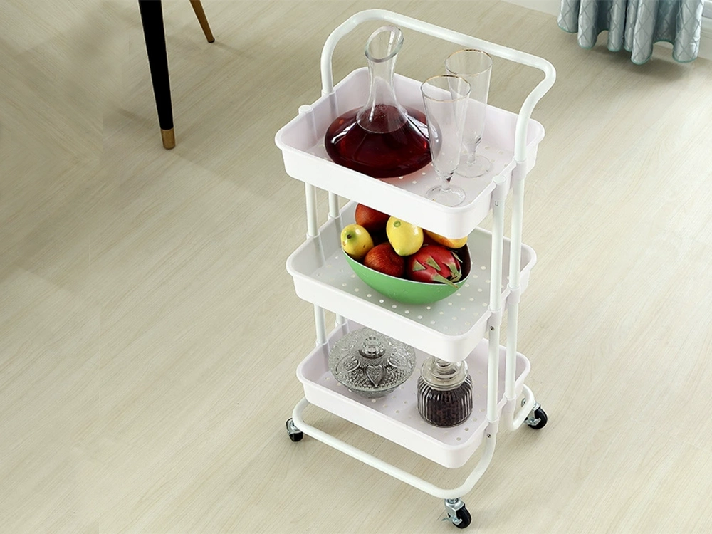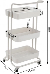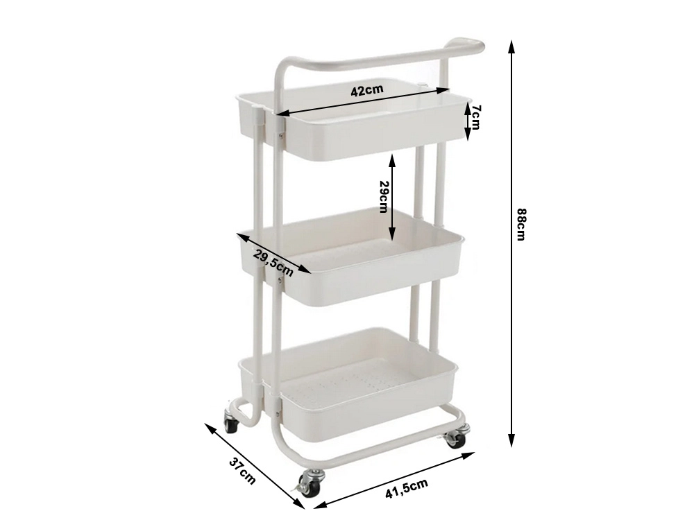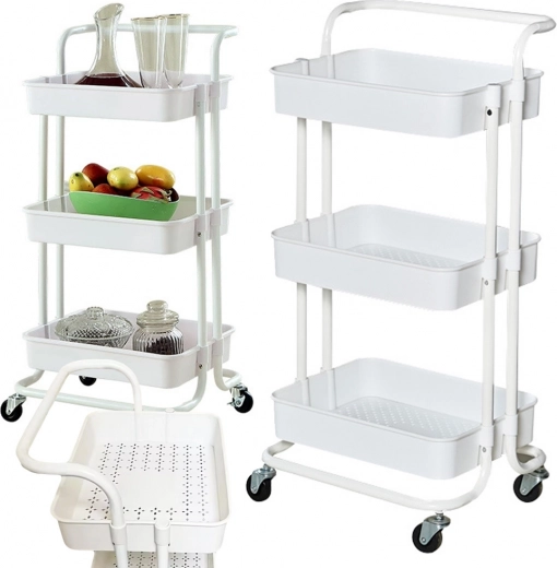 Elegant hvid rullereol, der kombinerer styrken fra en metalramme med funktionaliteten fra tre dybe hylder. Den perforerede bund i hver hylde fremmer luftcirkulation og er derfor ideel til madvarer, kosmetik og rengøringsmidler. De kompakte mål gør, at den passer i smalle rum, men den tilbyder alligevel overraskende god opbevaringsplads.