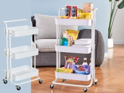 Nem håndtering sikres af 4 drejelige hjul og et praktisk håndtag; efter flytning låses reolen nemt med den indbyggede bremse. Den stabile konstruktion bærer også tungere genstande, og de forhøjede kanter på hylderne forhindrer, at indholdet falder ud under flytning.