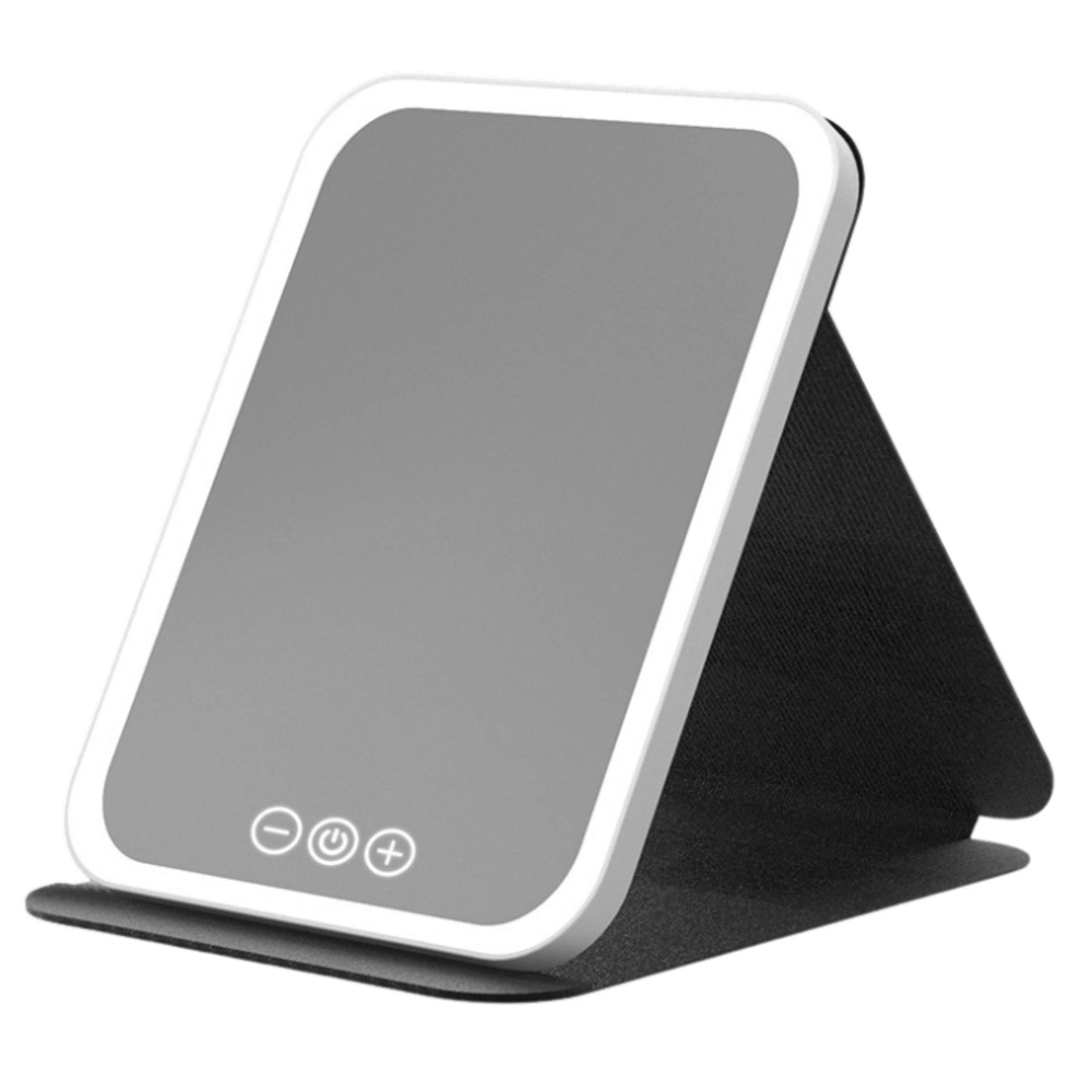 Nyd perfekt belysning til makeup i enhver situation. Det sammenklappelige LED-spejl med højkvalitets spejloverflade giver et skarpt og naturtro billede, mens de tre lysindstillinger – kold, varm og naturlig – hjælper dig med at finjustere makeuppen under forskellige lysforhold. Touch-panelet gør det nemt at skifte tilstande og trinløst justere lysstyrken for maksimal præcision.