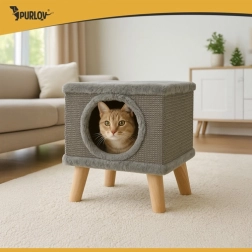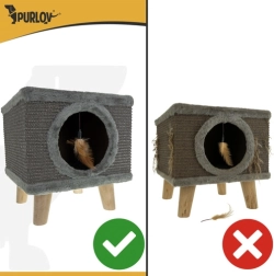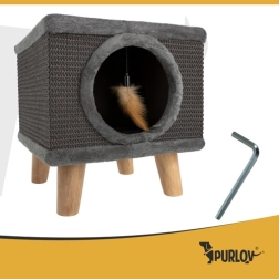 Leder du efter en kompakt og moderne løsning til din kat? Kattehuset PURLOV giver et hyggeligt tilflugtssted med blødt indre og samtidig et robust kradseområde af naturlig sisal på siderne. Den forhøjede konstruktion på solide træben sikrer stabilitet selv under vild leg, mens skridsikre fødder beskytter gulvet.