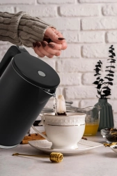 Den indvendige del i rustfrit stål er korrosionsbestandig og nem at rengøre, mens polypropylen-huset med dobbeltvæg føles køligere at røre ved og isolerer varmen bedre. Automatisk sluk ved kogepunkt og beskyttelse mod tørkogning øger sikkerheden i daglig brug.
