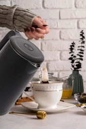 Bryg kaffe eller te når som helst og hvor som helst. Denne rejse-elkedel kombinerer kompakte mål med høj effekt på 1500 W, så vandet bringes hurtigt og energieffektivt i kog. Den indvendige beholder i rustfrit stål er hygiejnisk, korrosionsbestandig og let at rengøre, mens kroppen i polypropylen med dobbelt væg forbliver kølig at røre ved for øget sikkerhed.