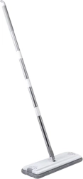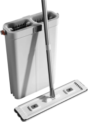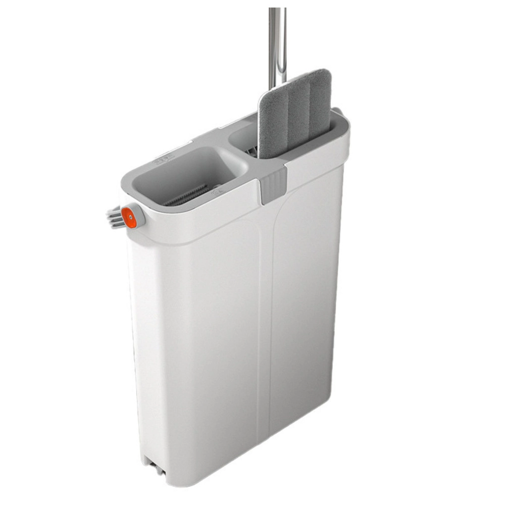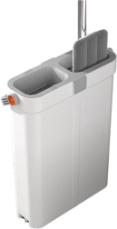 Den moderne spand med to kamre adskiller rent og snavset vand for en mere hygiejnisk og hurtigere rengøring. Fladmoppen med justerbart teleskopskaft tilpasses nemt brugerens højde og når ind i smalle områder, under senge og skabe.