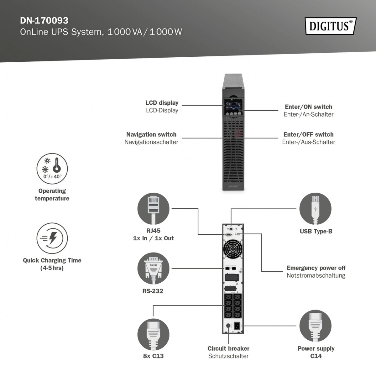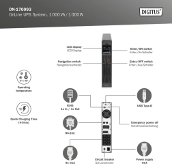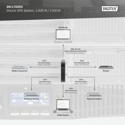 Den professionelle online UPS fra DIGITUS er designet til kontinuerlig beskyttelse af servere, netværksenheder og arbejdsstationer. Dobbeltkonvertering med mikroprocessorstyring sikrer ren sinus og stabil spænding uden omskift, så data og hardware beskyttes ved udfald, under- eller overspænding. Takket være høj virkningsgrad og kraftig oplader egner den sig også til krævende virksomhedsmiljøer.