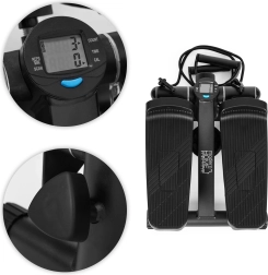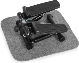 Det integrerede LCD-display (5 funktioner) viser tydeligt tid, skridt/min, samlet antal skridt, forbrændte kalorier og SCAN-tilstand. Skridsikre pedaler og stabiliserende fødder giver sikkerhed og komfort. Den beskyttende måtte af uldfilt dæmper vibrationer, beskytter gulvet og forhindrer, at enheden flytter sig – selv i mindre rum.