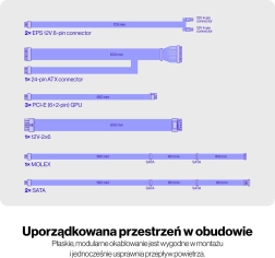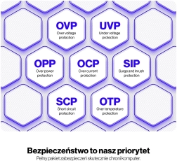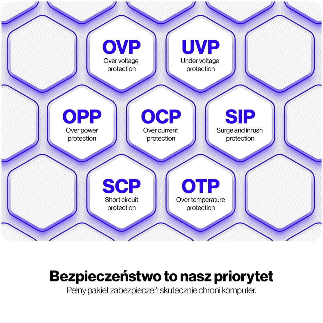 De anvendte japanske kondensatorer (105 °C) garanterer stabilitet under krævende forhold. Den fuldt modulære kabelføring forenkler kabelstyring, forbedrer luftgennemstrømningen og sænker temperaturerne. Et sæt af elektriske og termiske beskyttelser beskytter din pc mod overbelastning, overspænding, kortslutning og overophedning. Kvaliteten understreges af 10 års garanti.