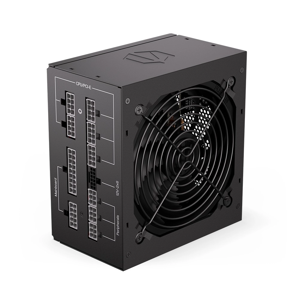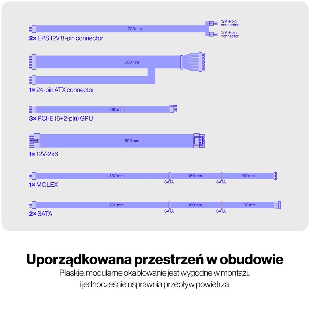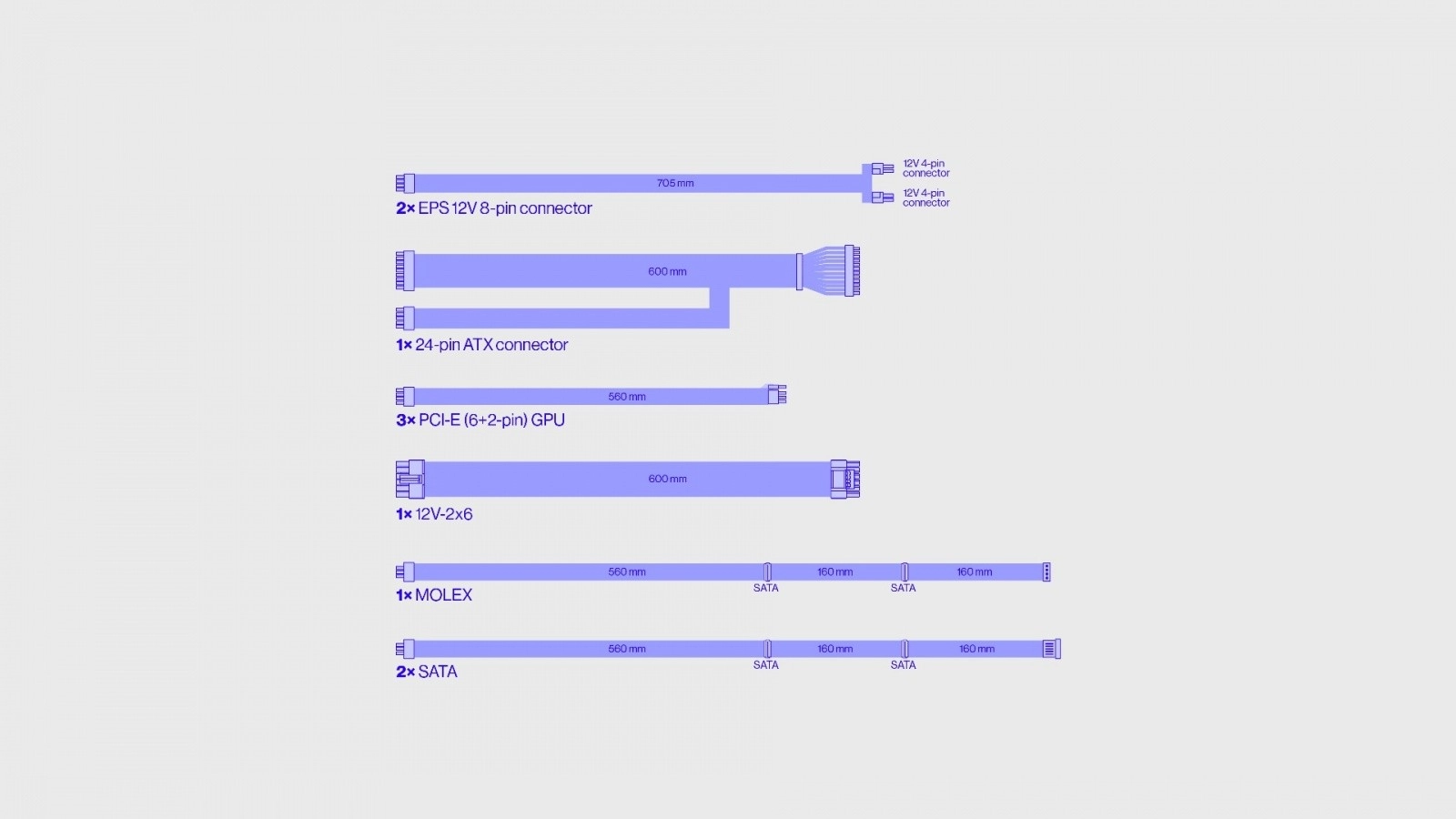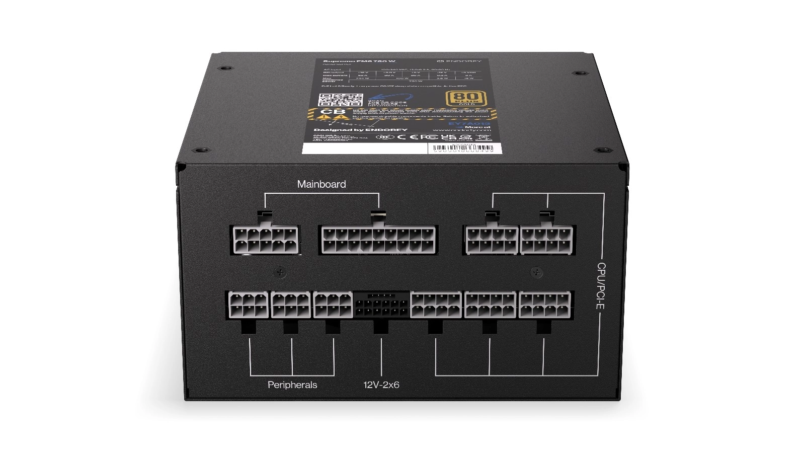 Supremo FM6 750 W opfylder den nyeste ATX 3.1-standard og håndterer også kortvarige belastningsspidser. I kassen finder du et 12V-2x6-kabel for fuld kompatibilitet med moderne PCIe 5.1-GPU’er, og der medfølger også klassiske PCI-E 6+2 PIN til traditionelle grafikkort.