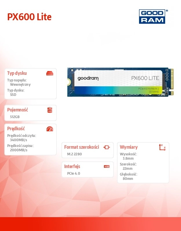 Det hurtige og energieffektive SSD-drev PX600 Lite med kapacitet på 512 GB leverer PCIe 4.0 x4-ydelse til lynhurtig indlæsning af system og spil. Formfaktoren M.2 2280 passer til moderne bærbare og desktops, og tilbyder læsehastigheder op til 3400 MB/s og skrivehastigheder op til 2000 MB/s, samtidig med at det er modstandsdygtigt over for stød og vibrationer.