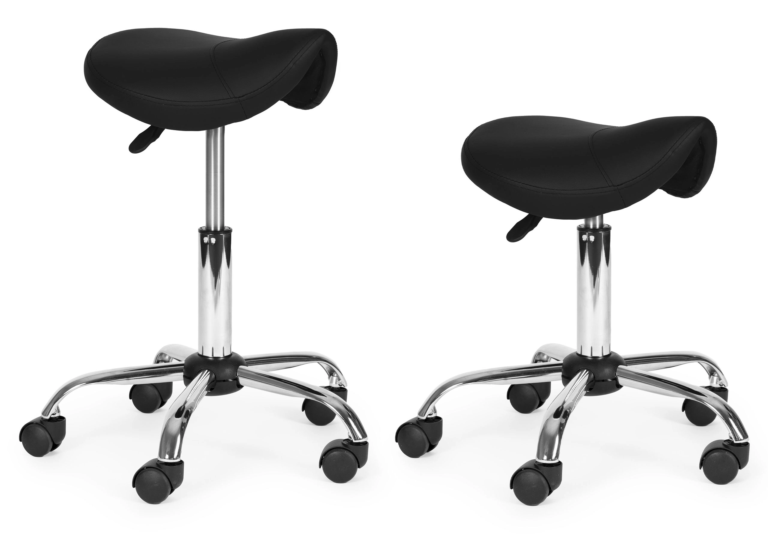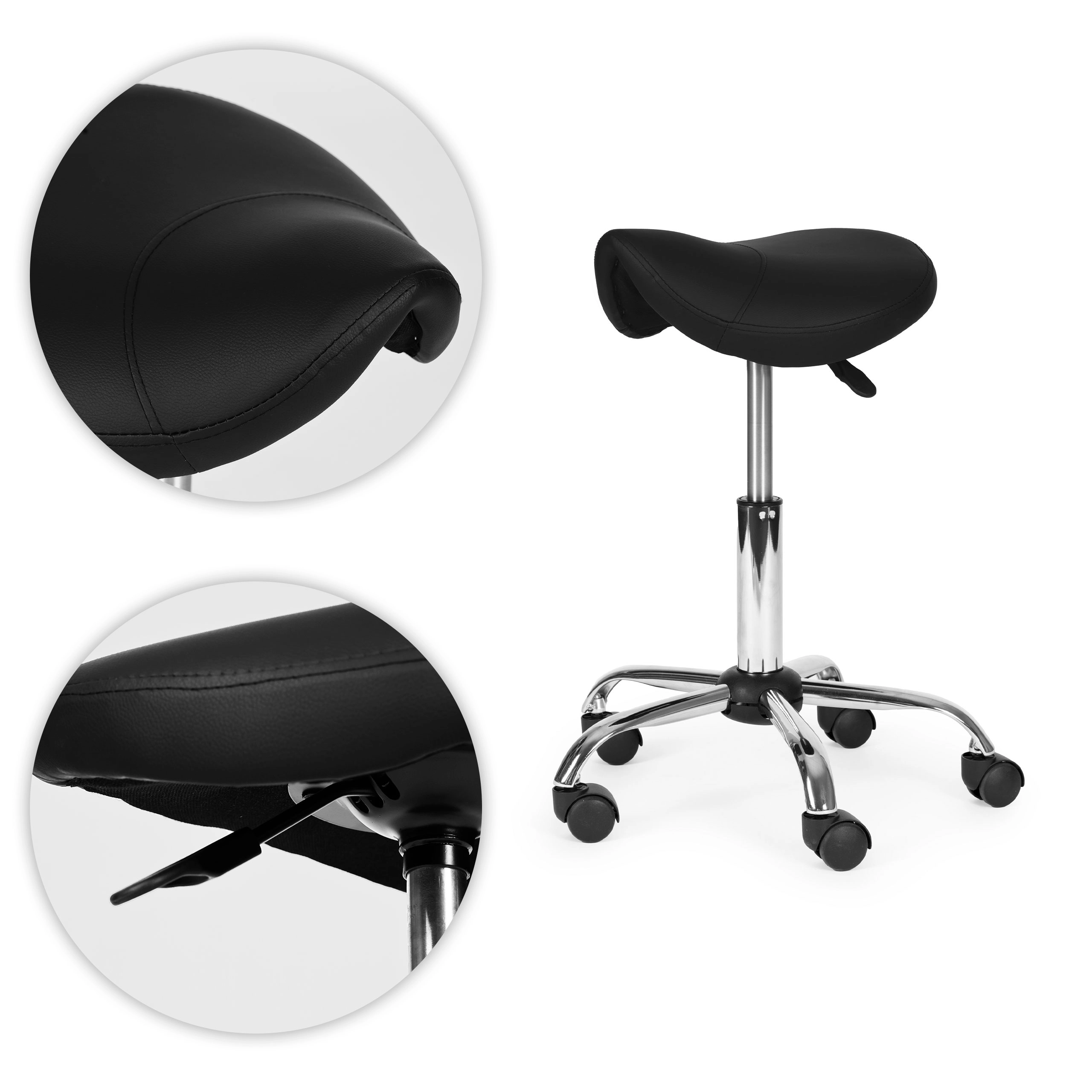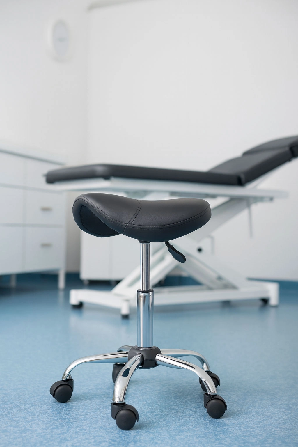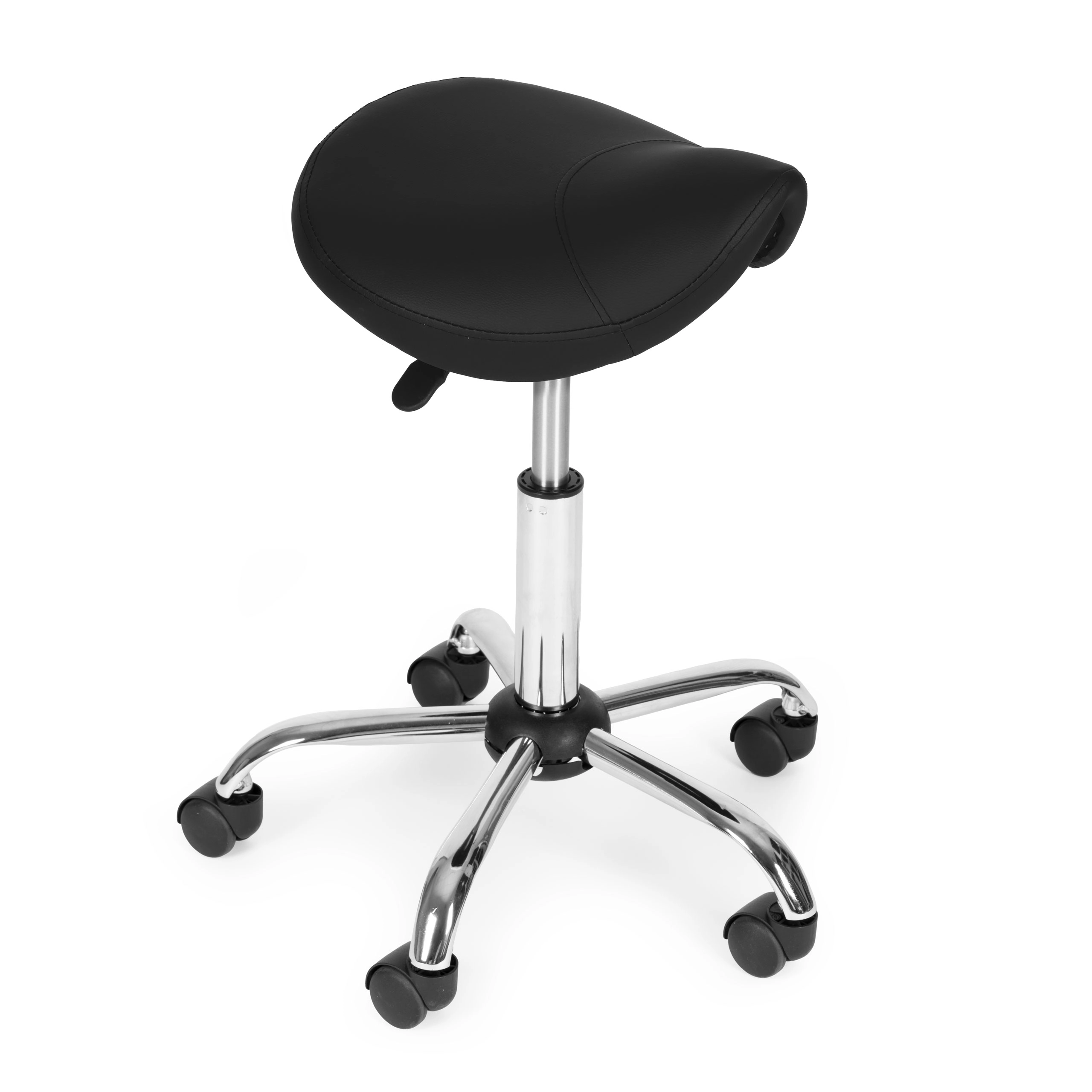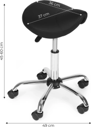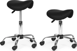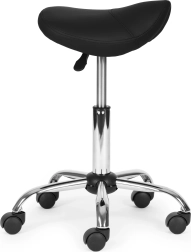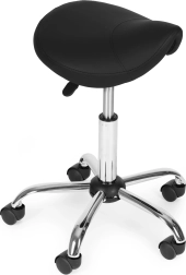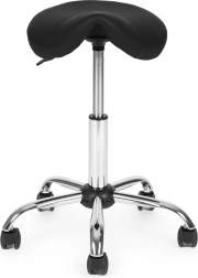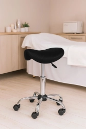 Professionel drejestol med saddelsæde til skønhedssaloner, frisører og klinikker. Den tilbyder ergonomisk form, trinløs højdejustering, 360° drejeligt sæde og stabil femstjernet base med hjul. Holdbart PVC-betræk, metalkonstruktion og maksimal belastning på 150 kg sikrer lang levetid og komfort under arbejdet.