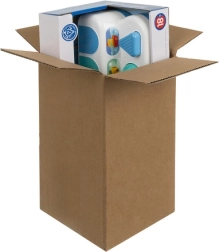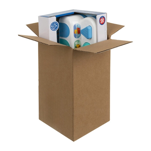 - Legetøj, brugsvejledning, farverig emballage, brun forsendelseskasse
